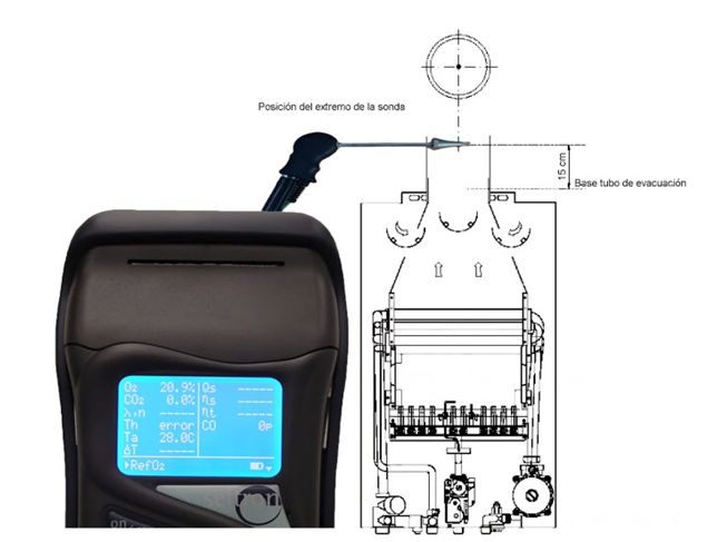 La toma de muestras se debe hacer en el punto ya preparado para realizar el análisis correspondiente. Si no existe dicho punto, debe de realizarlo un técnico especializado. Se introduce la sonda en un orificio de diámetro mínimo en el centro de la salida de humos.